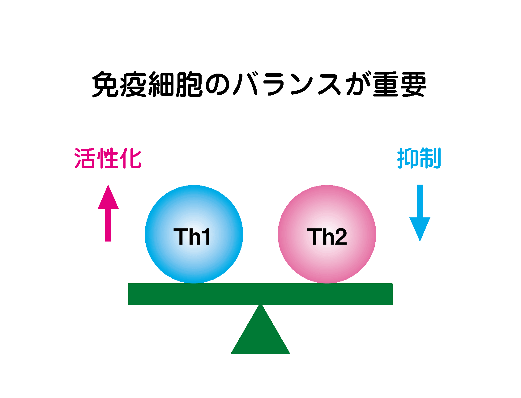 「免疫細胞」は2種類あり、細菌やウイルスに働く「Th1 細胞」と花粉や埃などに働く「Th2 細胞」と、それぞれ異なった役割があります。