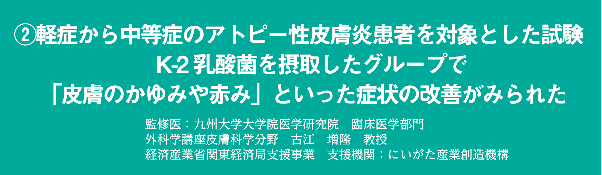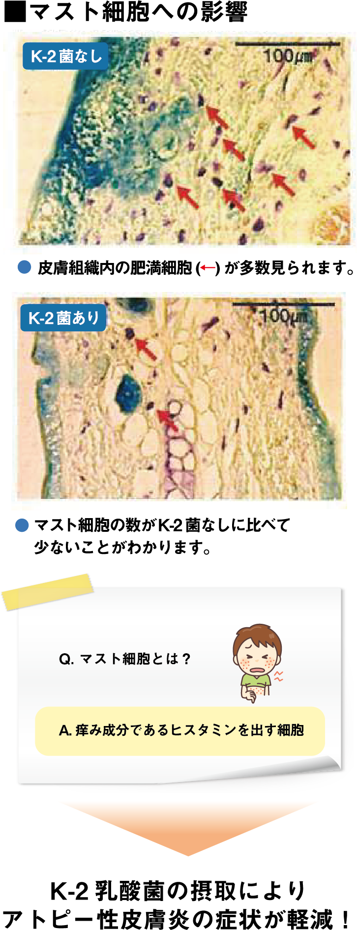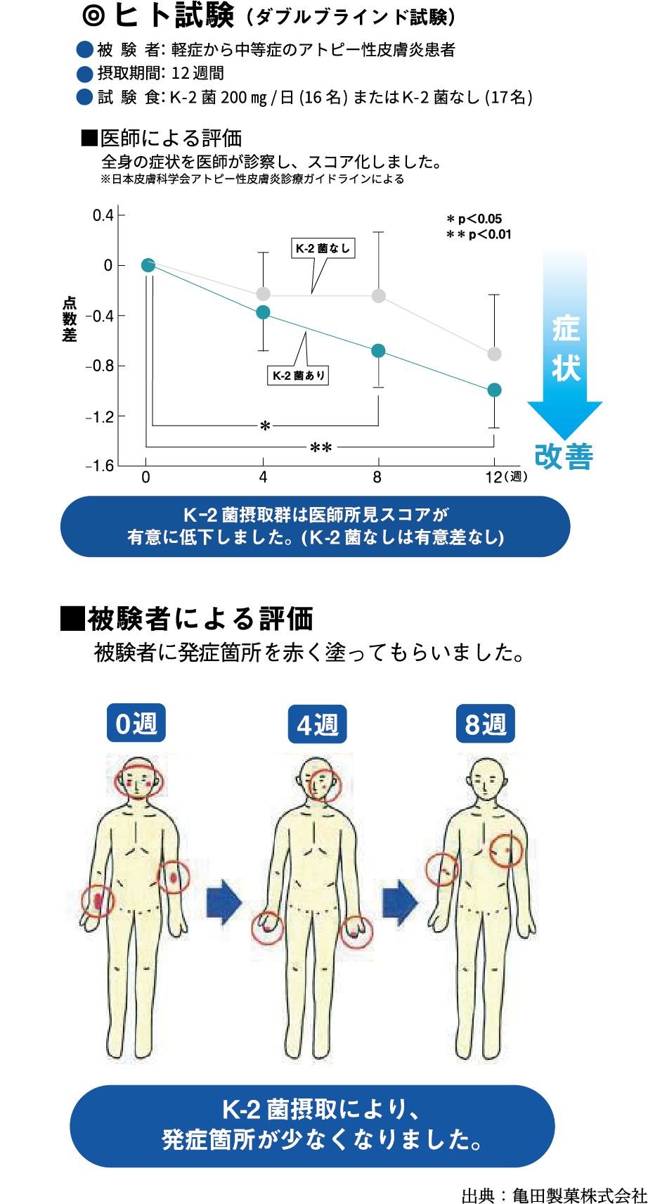 さらに K-2 乳酸菌を毎日摂取することでアトピー性皮膚炎の症状が軽減されていることも確認された。