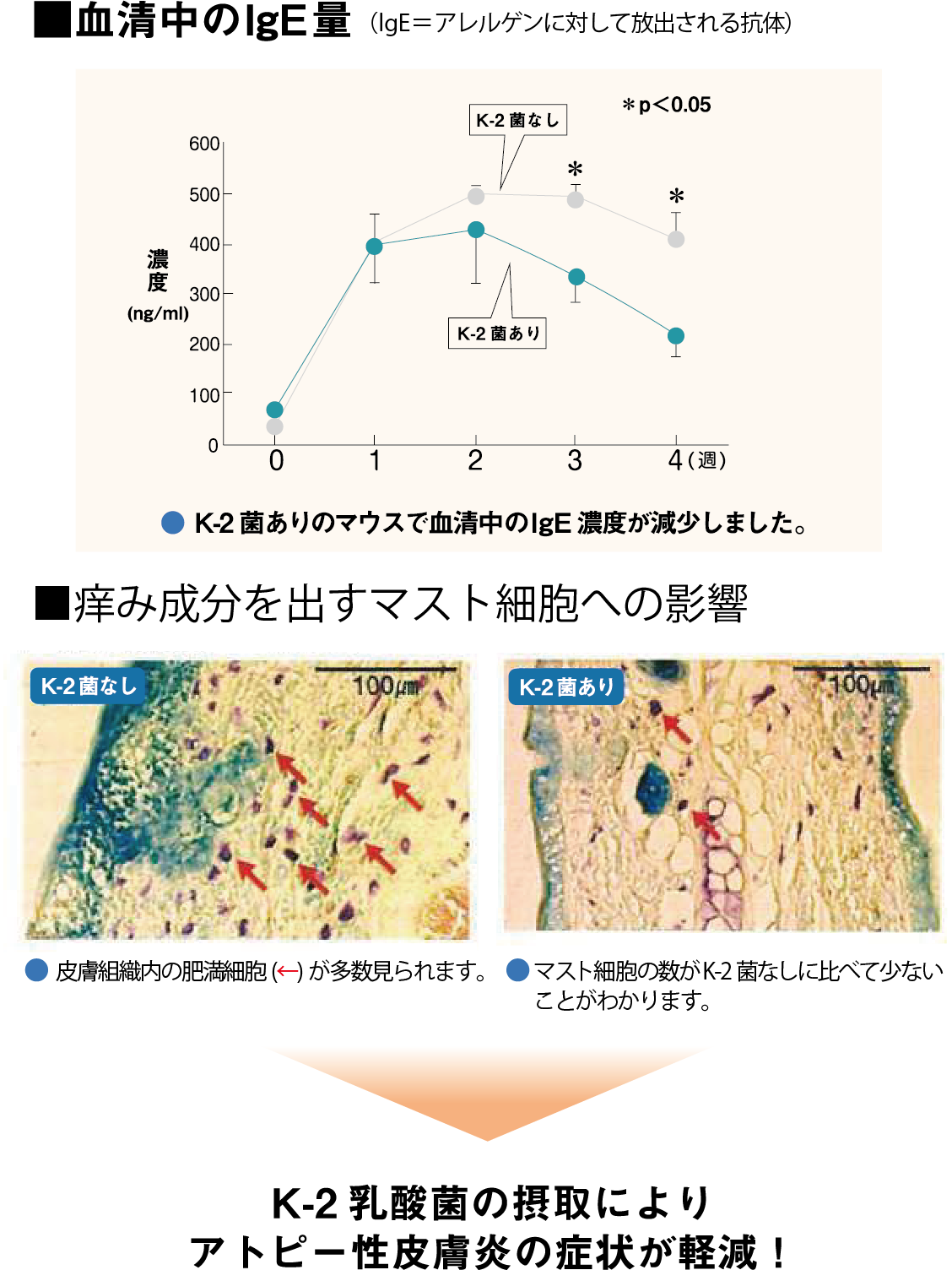 ・さらに K-2 乳酸菌を毎日摂取することでアトピー性皮膚炎の症状が軽減されていることも確認された。
